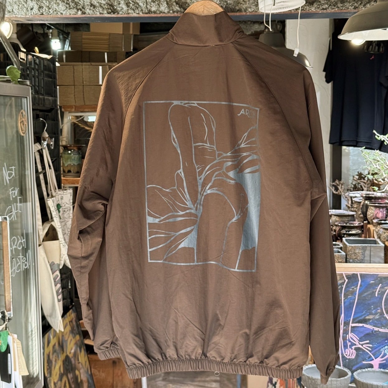 ジャケット背面にモン◯ーパンTのプリントを入れています。