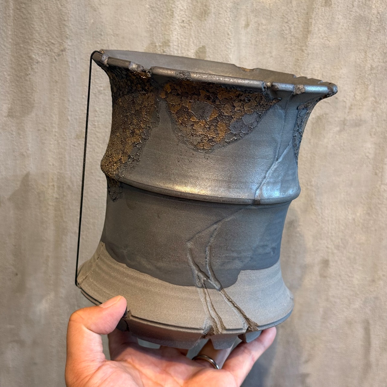 こだわりの黒土に釉薬は金属のように渋く輝く釉薬。