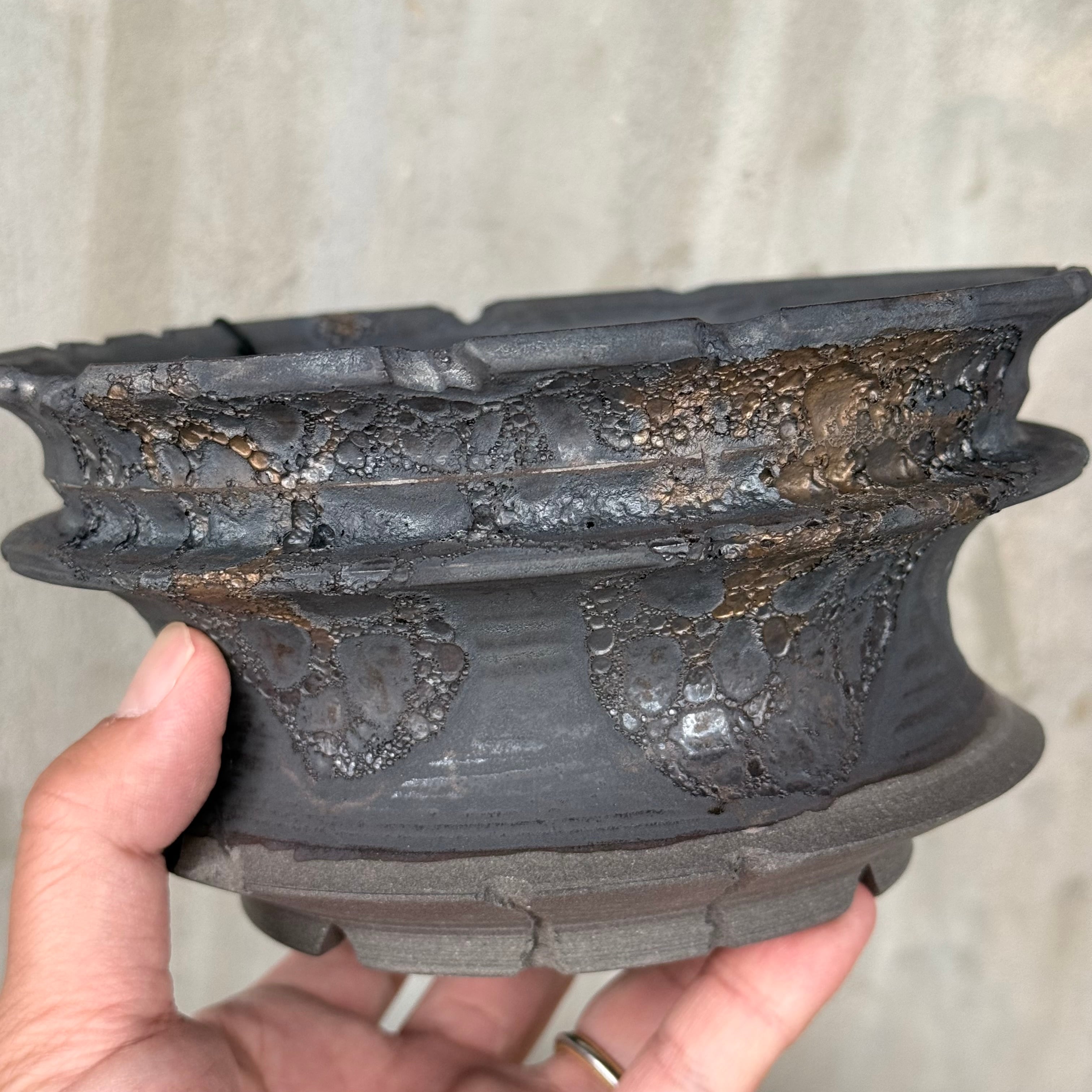こだわりの黒土に、金属のように鈍く輝く釉薬。