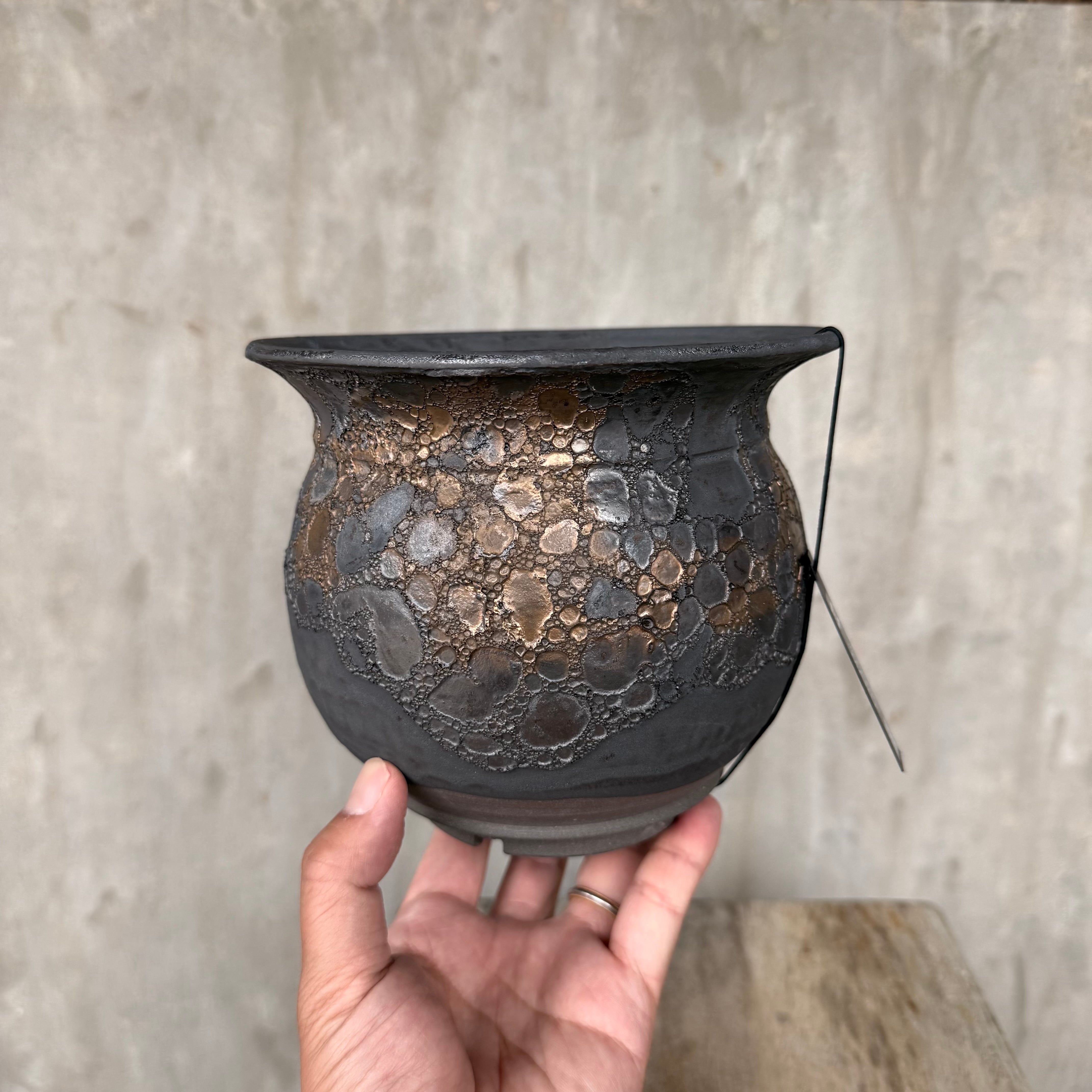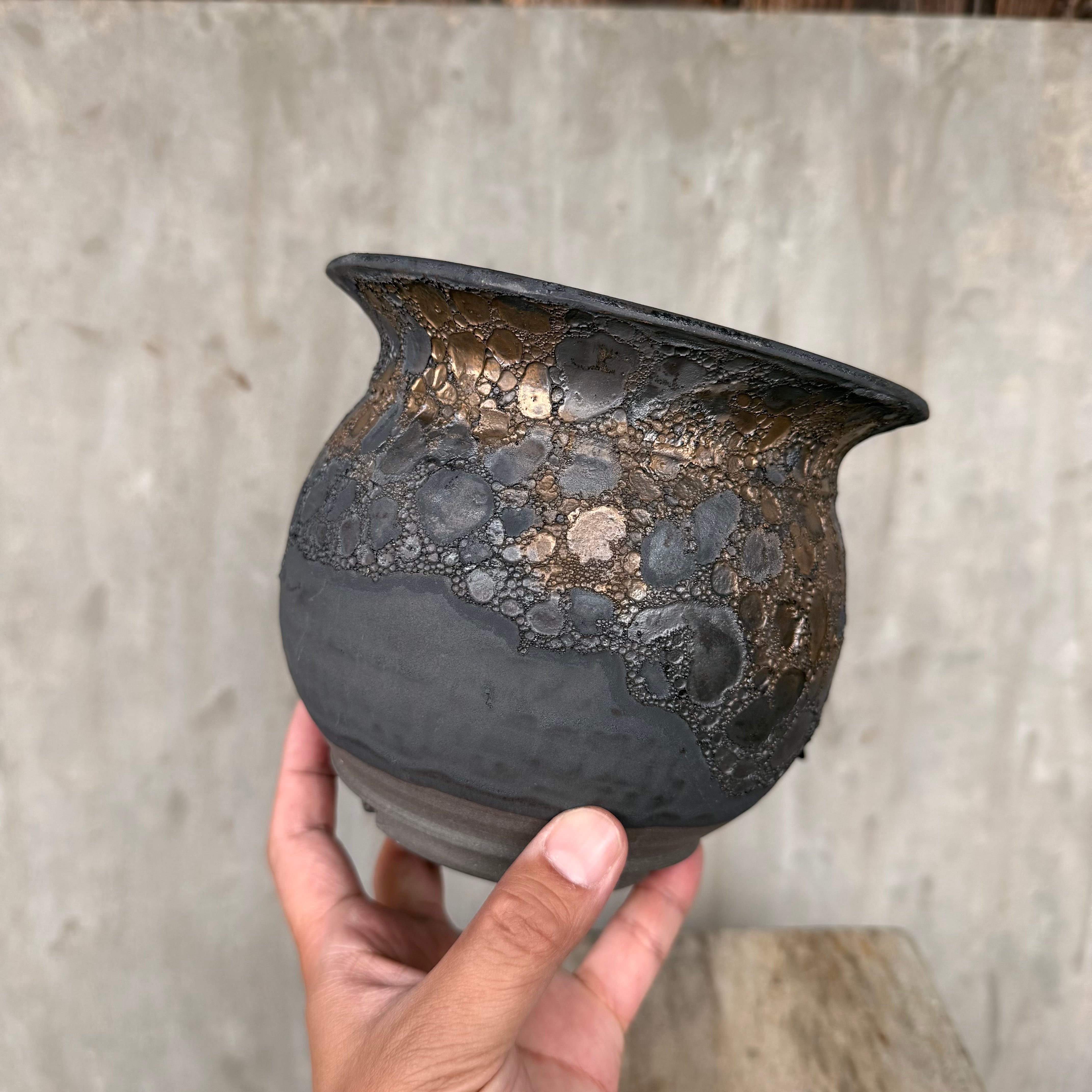こだわりの黒土に、金属のように鈍く輝く釉薬。