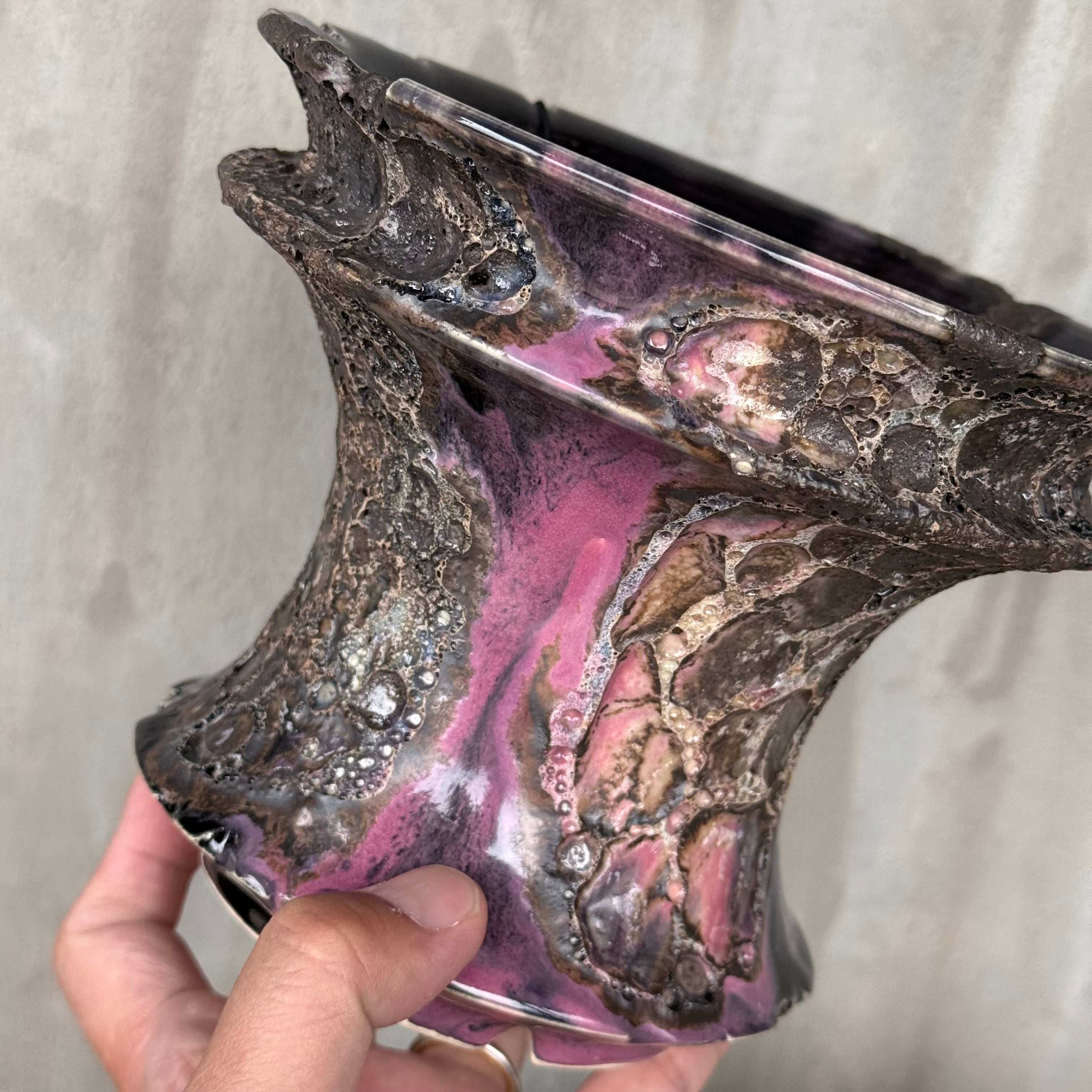 ダーク系の釉薬と発泡釉薬と合わせかけなので、