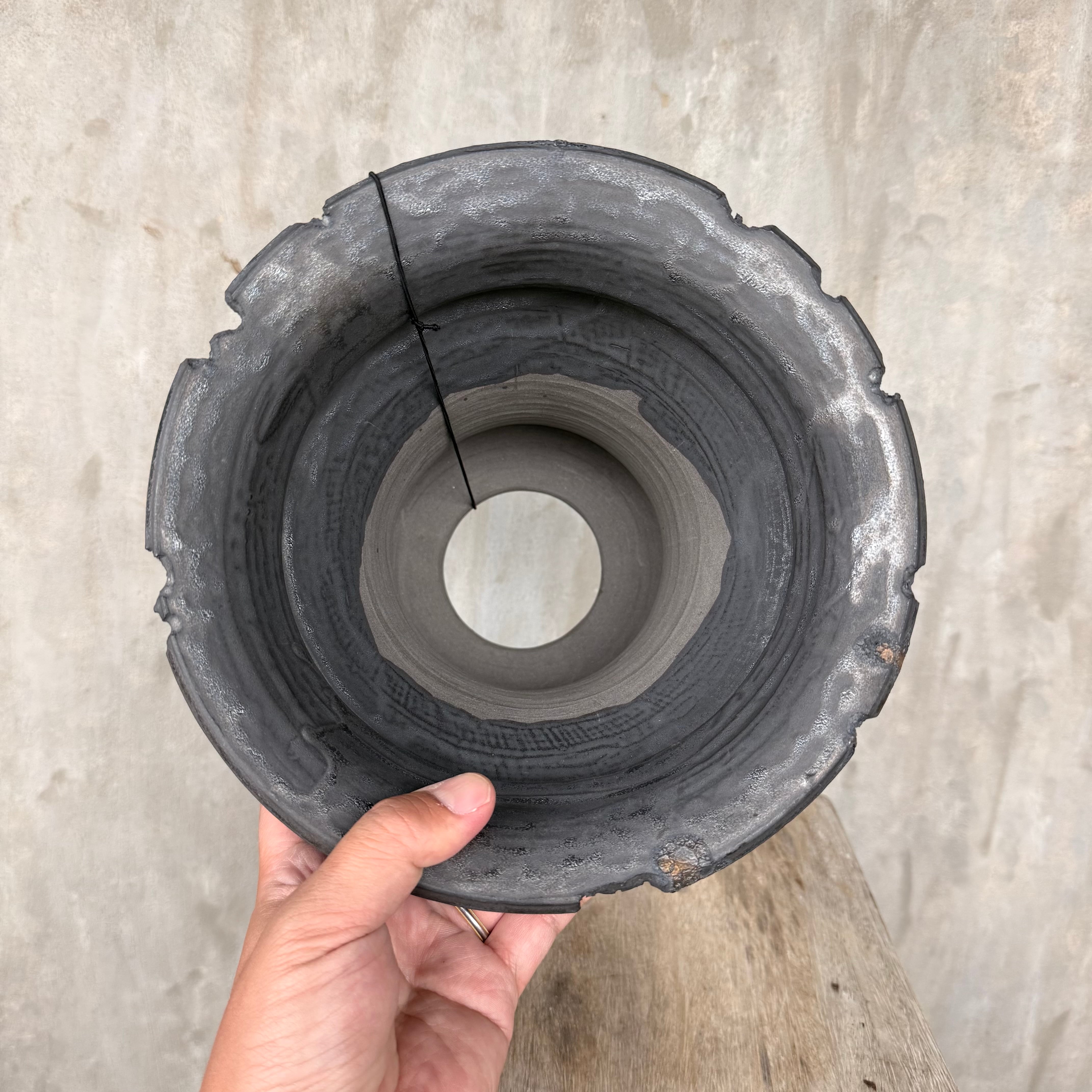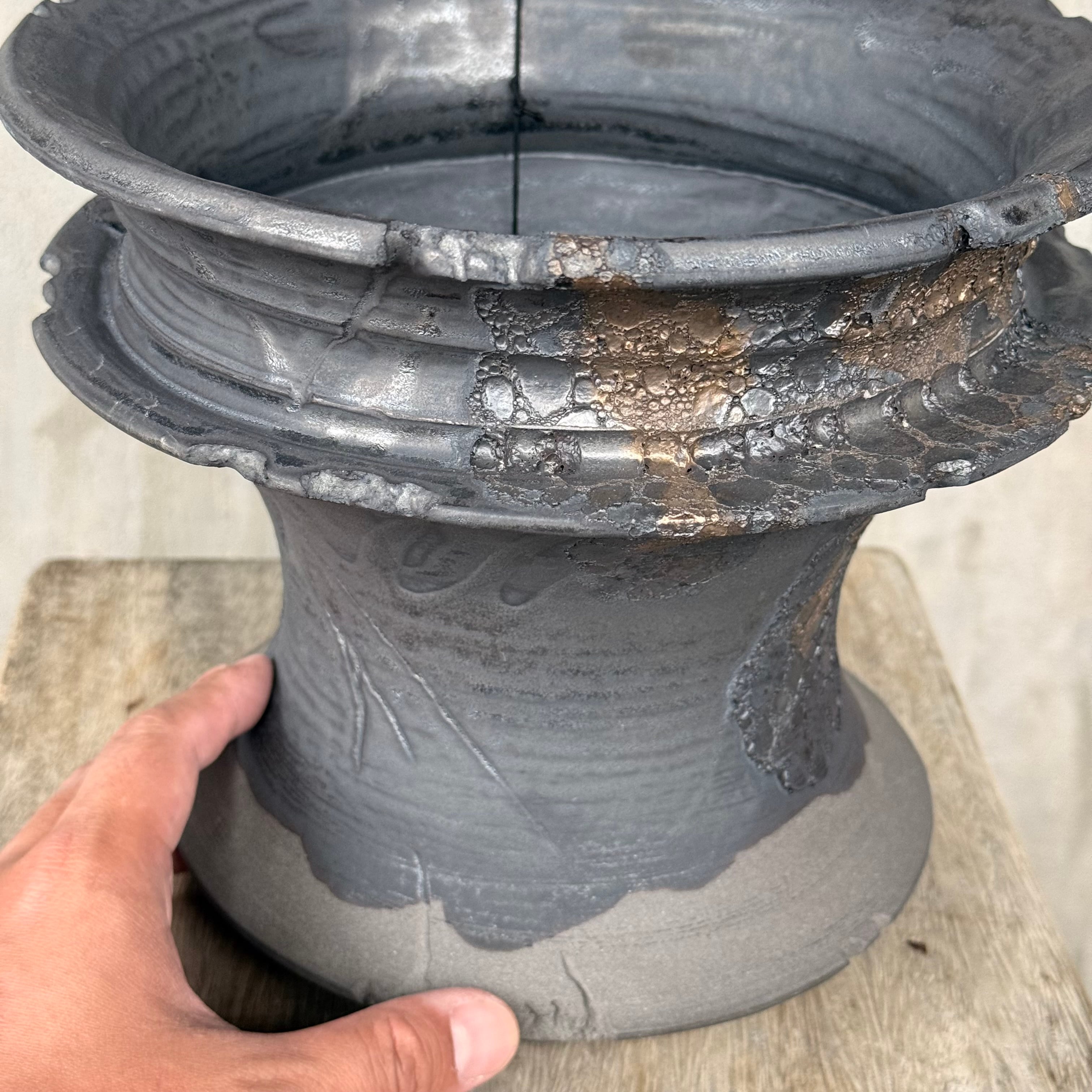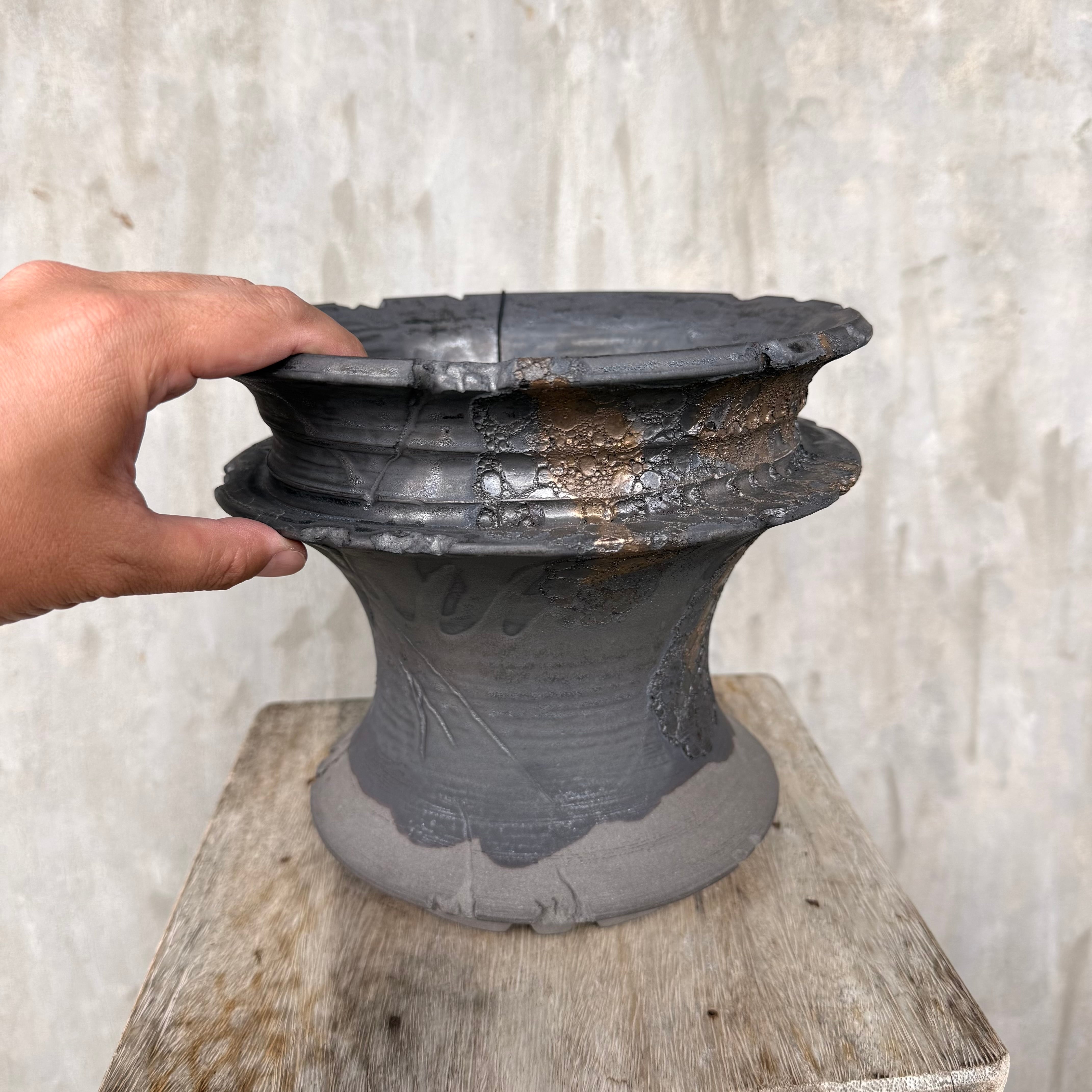 こだわりの黒土に、金属のように鈍く輝く釉薬。